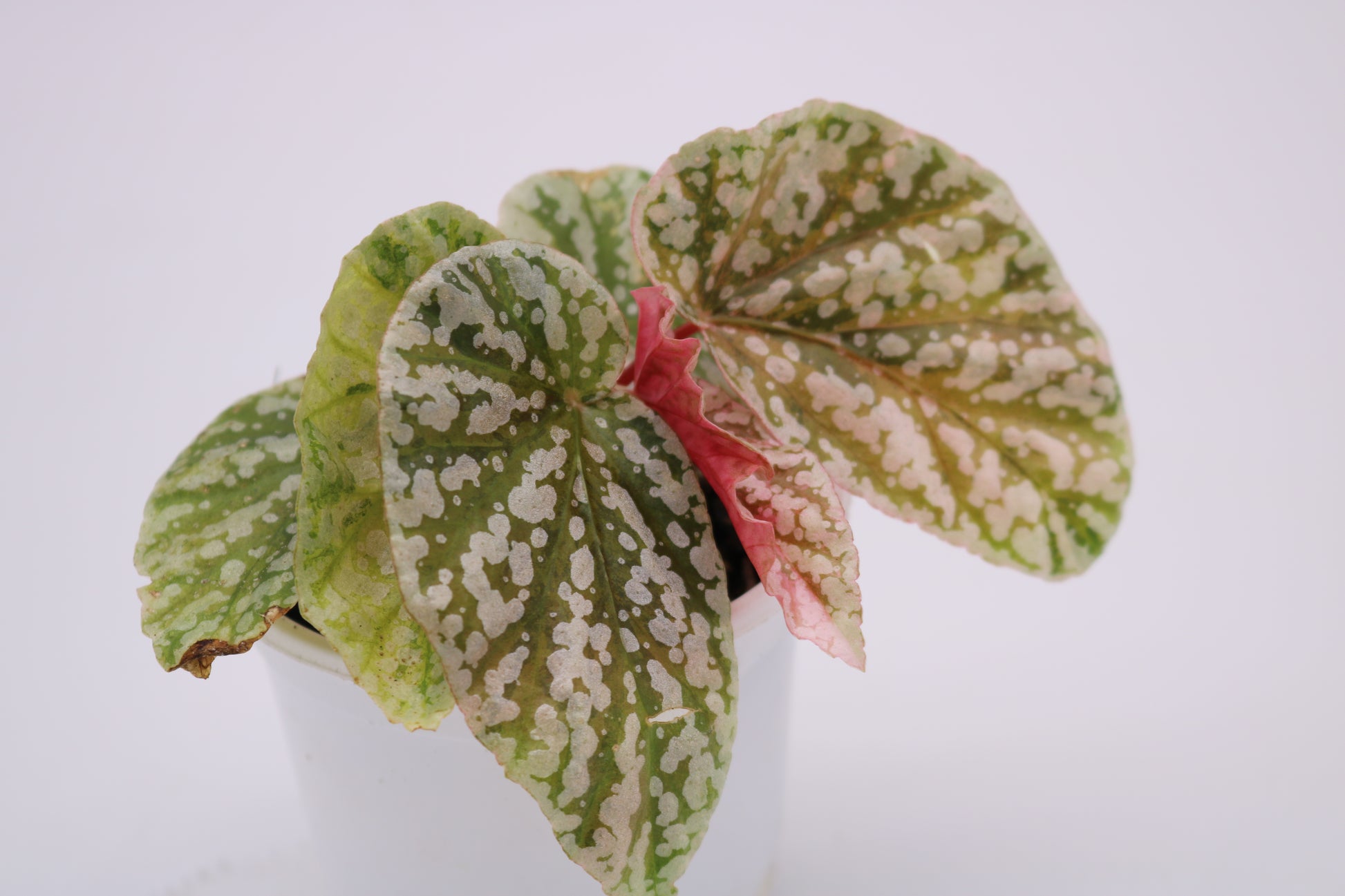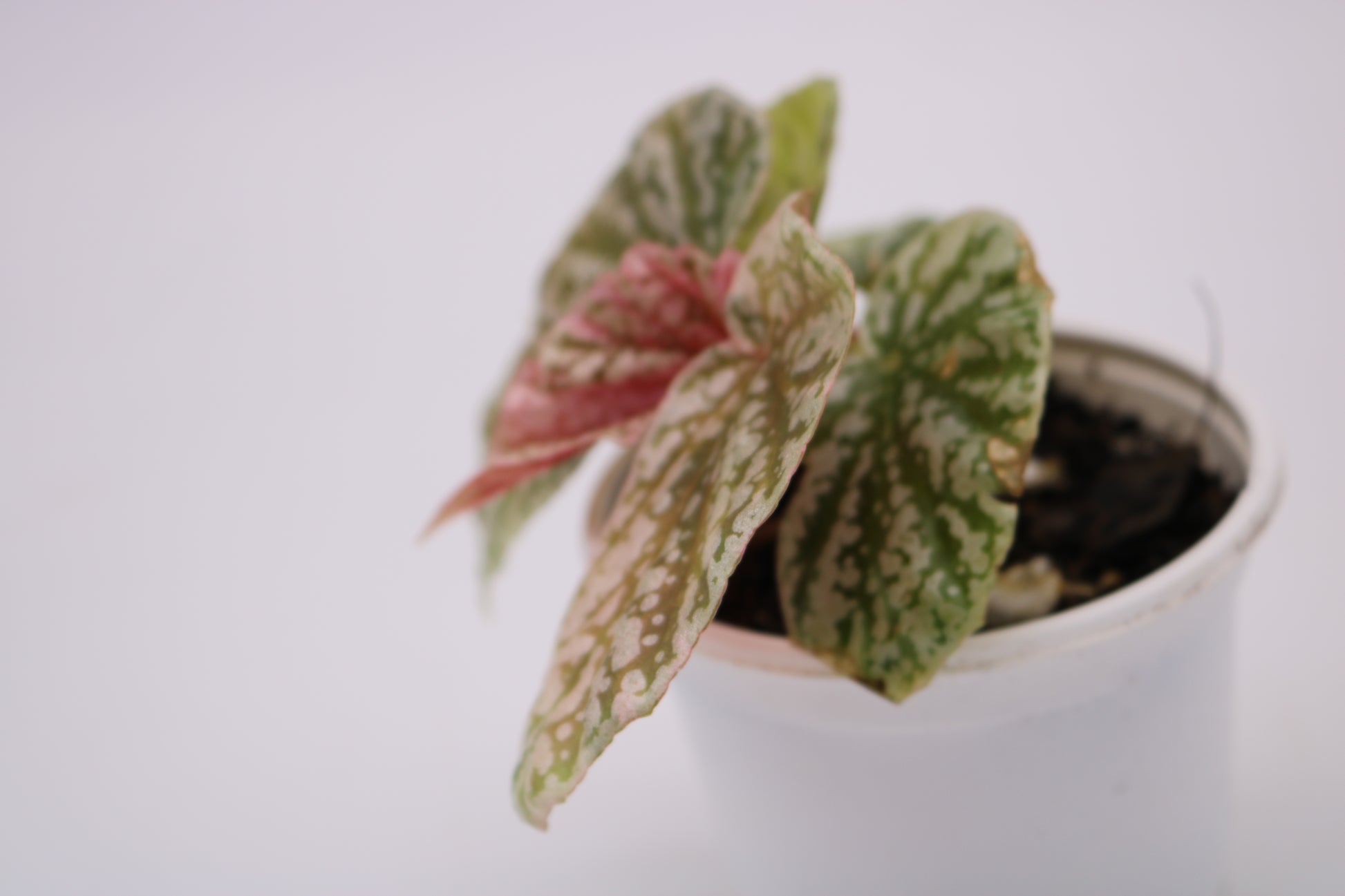 Begonia Snow Capped Variegated a delicate appearance with hues of green, white, pink and yellow. This as other begonias require high humidity and high indirect light for higher variegation.